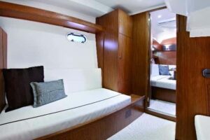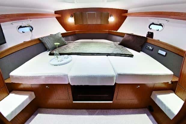 La cabina de proa presenta la litera tradicional en V, con una pieza corredera en los pies que cubre el hueco.