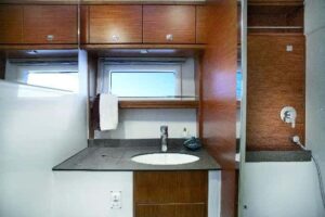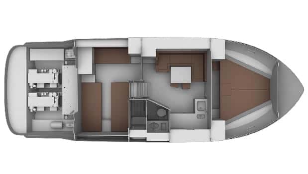El layout de planta contempla dos cabinas, un aseo independiente, una cocina y un salón, todos y cada uno de los espacios de buenas dimensiones. Los aspectos más importantes de esta parte del barco son: volumen, luz, sobriedad en la decoración, funcionalidad y la sensación de confort que ofrece todo el interior.