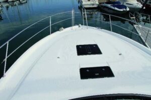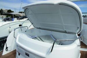La altura del francobordo de este barco no es obstáculo para que mantenga un perfil estilizado. En este modelo especialmente, y en relación a los demás de la gama, presenta una popa totalmente rediseñada, con una buena plataforma de baño y un solárium que cubre la cámara de motores. Aquí el astillero ha previsto un enorme cofre de estiba ideal para lonas y defensas. La entrada por ambas bandas desde la popa es otro detalle a considerar, ya que además del acceso directo a la bañera, el paso de babor lleva directamente a proa sin pasar por la bañera. Los laterales son anchos y están bien protegidos y en el arco de radar encontramos sendas piezas de inox a modo de asideros. La proa puede alojar colchonetas de solárium, y delante la maniobra de fondeo cuenta con lo necesario, aunque hay accesorios que forman parte de la lista de opcionales.