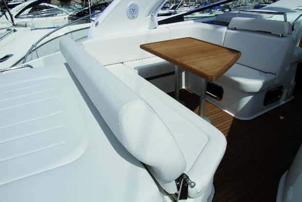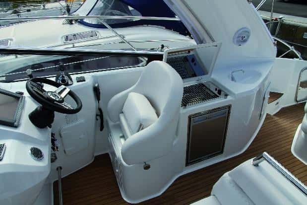 La dinete es grande, complementada por el mueble de servicio, en realidad un wet bar o una sencilla cocina exterior, que evita el tener que entrar a la cabina para preparaciones de aperitivo o culinarias de verano. Cofres, un diván a babor, buenos acabados, portavasos, etc. No falta nada. Pero, por otra parte encontramos deslumbrante la bañera. Deslumbrante porque las tapicerías blancas con el gelcoat blanco, bajo el sol del veranos exigen gafas de sol. Claro que si el armador desea las tapicerías color crema, Bavaria las tiene.Bañera bien proporcionada, de fácil movimiento, perfecta para una Open de cierto porte, como es esta Sport 39.