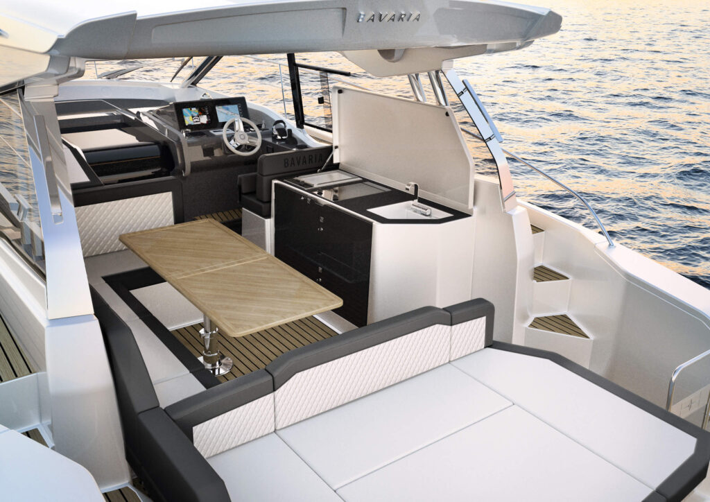 Una zona exterior perfectamente estudiada con una planta optimizada, funcional, cómoda y muy racional, sin elementos que entorpezcan la funcional que busca Bavaria en este barco.