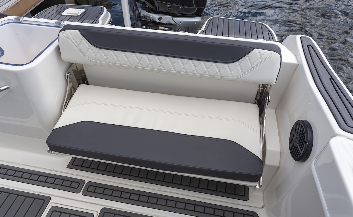 Por supuesto, tanto su estética como su equipamiento general se mantienen en la línea de las necesidades de quienes practican la pesca deportiva, pero su confort, la variedad y distribución de los asientos y, principalmente, la seguridad que ofrecen sus líneas de casco permiten un uso más lúdico y variado. En cuanto a los asientos, es interesante el sistema escogido en proa que, mediante una pieza removible, permite ampliar la superficie para tomar el sol, utilizarla como respaldo para mayor comodidad durante la navegación o retirarla para tener más espacio a la hora de pescar.