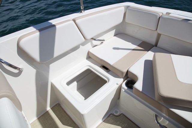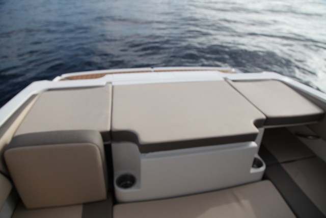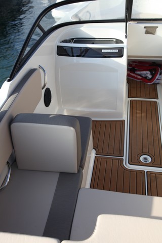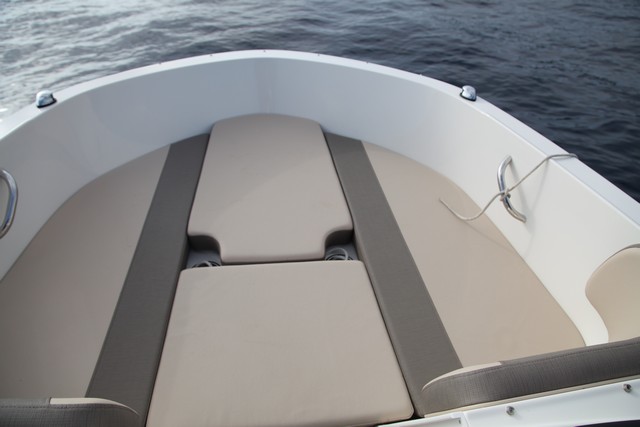 Salvo esto, ofrece la misma configuración, con proa abierta, banco en popa y un asiento del acompañante cuyo respaldo reclinable permite formar un diván a babor.