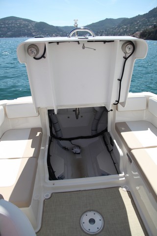 La motorización con fueraborda obtiene la cámara de motores de popa vacía, por lo que la capacidad de estiba es enorme, especialmente si se compartimenta. En el piso de la bañera no falta el clásico cofre alargado para los esquíes, y bajo los asientos laterales y de proa también se aprovecha el espacio para estiba.