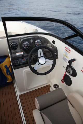 Por su parte, el puesto de gobierno se corresponde a las exigencias de esta lancha. Asiento anatómico, ajustable, con reposapiés y una consola con la relojería de Bayliner, aunque preferiríamos la de lo motor Mercury, más clara y legible. Un puesto, no obstante, bien adaptado a esta embarcación para navegar por encima de los 37 nudos.