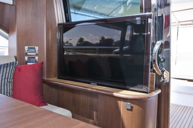 Un sofá en la popa con una gran mesa fija y dos muebles enfrente presiden este espacio. Llama la atención el bar junto al espacio de la cocina interior con dos taburetes que queda en comunicación total al levantar parte de la mampara de vidrio y acero que separa el salón. Bajo la escalera de acceso al fly otro mueble con escalones y armarios completa el espacio de la bañera. De hecho es un salón abierto ya que permanentemente queda cubierto por el toldo que cubre hasta la plataforma de baño.