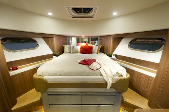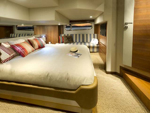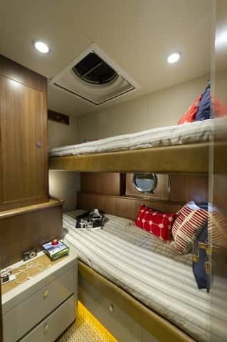 La cabina de proa, sin ser excesiva en dimensiones es muy agradable, con dos armarios roperos y acceso directo al segundo baño; y la tercera cabina, con dos literas, más reducida, ocupa la banda de babor. Entre los detalles se esconde un armario, junto a la entrada de la cabina de proa, con la lavadora secadora y estantes para la ropa de servicio.