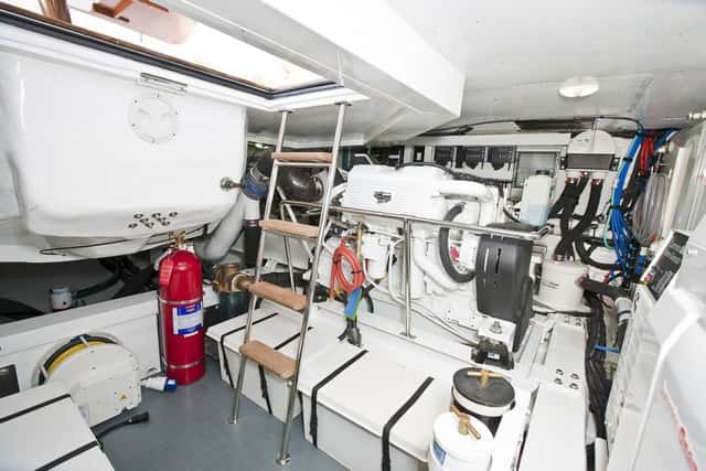 En cuanto a los motores hay que reseñar que los Cummins se han ubicado hacia el centro (hacia proa) del barco para mejorar el asentamiento, con la transmisión adecuada hacia los pods Zeus, más retrasados, y para poder disponer de espacio en el garaje. Las instalaciones son impecables y el generador viene de serie.