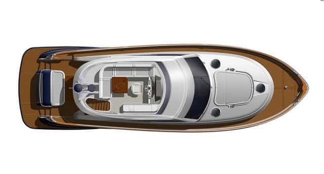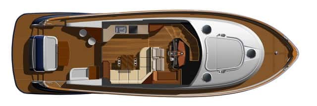 Otro elemento importante en este crucero es el fly, basado en un diseño conservador, sin pretensiones de ganar espacio hacia popa, de dimensiones más bien reducidas en comparación a los fly de los barcos de Mediterráneo. Un mueble de servicio con fregadero y nevera se complementa con la dinete de popa, en forma de L y una mesa de doble ala desplegable. Es un espacio que queda muy protegido y en perfecta integración con el puesto de gobierno central.