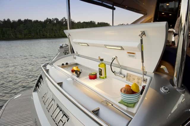 No son pocos los detalles en la Belize 54, como este mueble de servicio en la popa