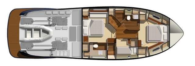 Con transmisiones por pods Zeus y dos motores Cummins QSB8.3 de 600 Hp este barco encuentra una potencia correcta, aunque no excesiva. Prueba de ello es que en un futuro se ofrecerá con motorizaciones de 715 Hp y con pods Zeus para poder ganar en tres o cuatro nudos la velocidad punta.
