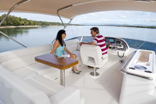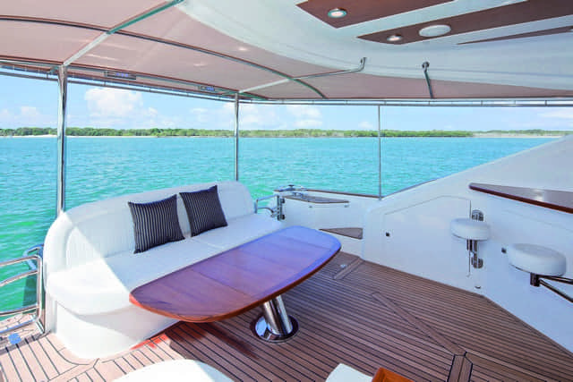 La bañera de popa queda cubierta permanentemente por un soft top que se prolonga del fly. Una robusta mesa fija se complementa con el sofá.