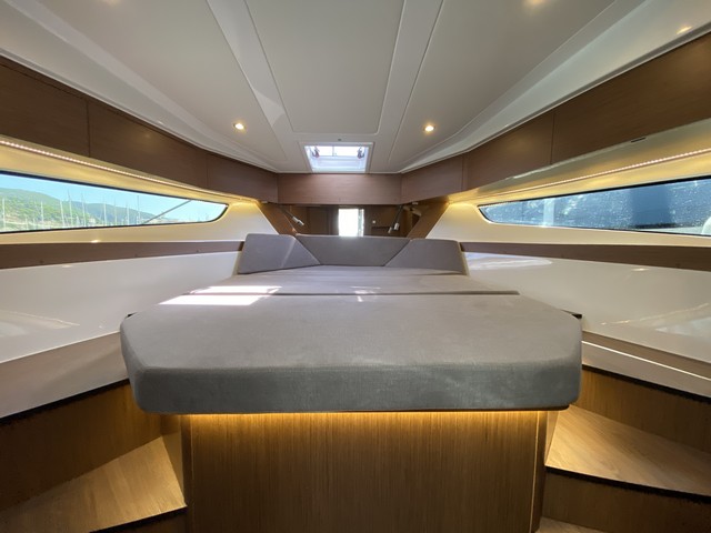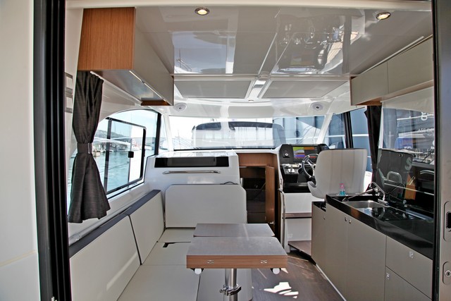 Luminosidad y habitabilidad caracterizan esta gran weekender. Las grandes cristaleras de la timonera y del techo favorecen una total visión panorámica. El salón está presidido por la dinete a babor, que como hemos apuntado, se puede prolongar hacia el exterior en combinación con la de la bañera. El asiento de proa del salón, además, bascula para quedarse mirando hacia proa, lo que incrementa la versatilidad de este espacio.