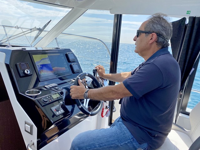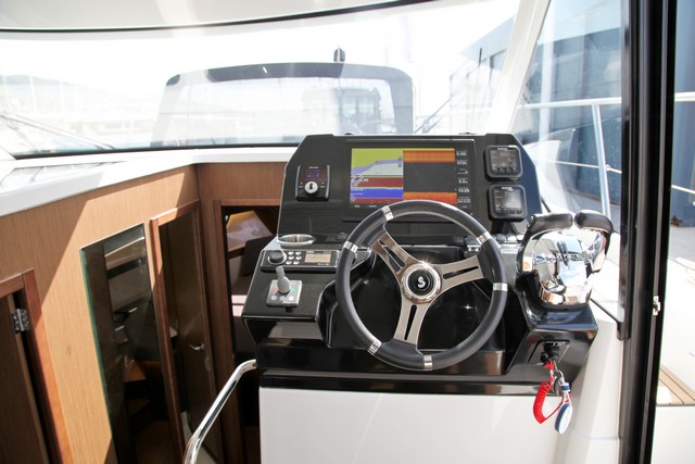 Prácticamente impecable. Funcional, con una disposición compacta pero ordenada en la consola, en la que no faltan los equipos esenciales. Una gran pantalla multifunción, los dos indicadores digitales de los motores de Suzuki, un equipo de flaps automáticos de Zipwake, el equipo de música, la hélice de proa y las palancas electrónicas. Todo en su justo lugar. Nos gusta especialmente la disponibilidad de una guantera bajo el volante y el portavasos, siempre más útil para para dejar el móvil o las gafas de sol. No falta un compás ni un reposapiés, que contribuye a la ergonomía de este puesto. El asiento es ajustable y el sistema de dirección electrohidráulicas permite una conducción suave y precisa.