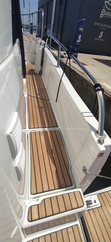 Son destacables también las semiplataformas de baño, con acceso directo a la de estribos, los cofres de estiba en el piso de la bañera, grandes, donde cabe casi cualquier cosa, y la toldina extensible sobre la bañera de popa, que se recoge con facilidad al ser de tejido. A esto se añade también el parasol desplegable de proa que protege los cabezales del solárium, reforzando la este espacio como zona de estar.