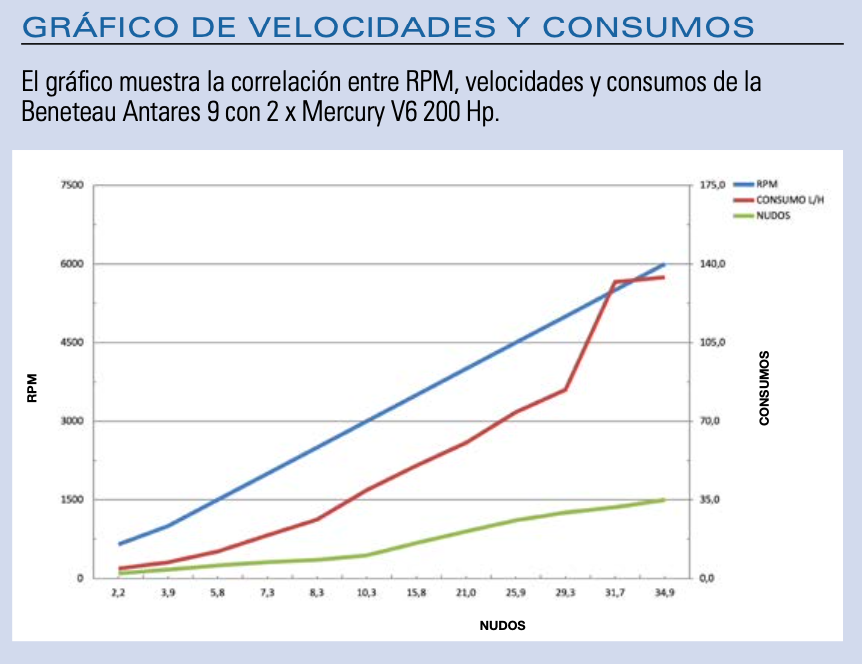 Con dos motores Mercury V6 de 200 Hp cada uno, la Antares 9 logra fácilmente y con seguridad los 34 nudos.
