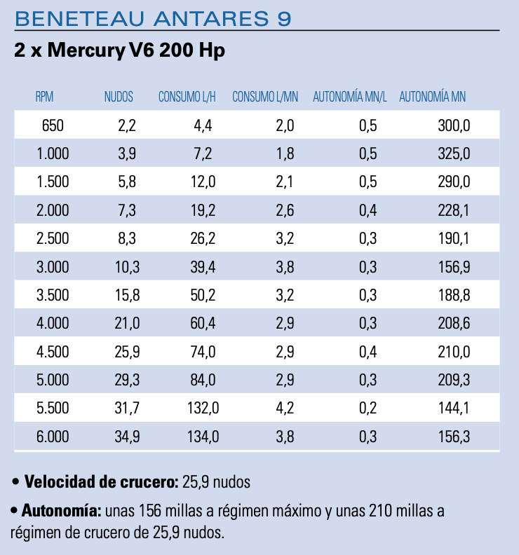 Autonomía: unas 156 millas a régimen máximo y unas 210 millas a régimen de crucero de 34,9 nudos.