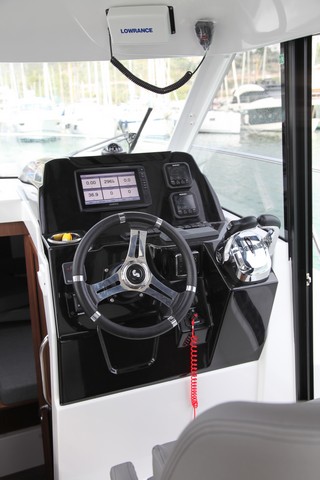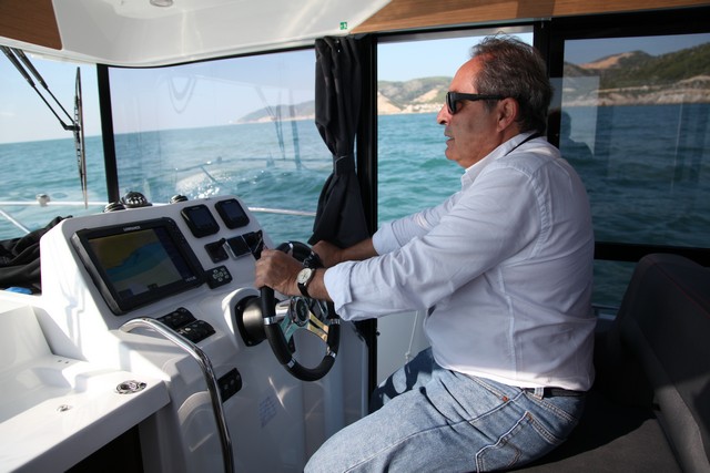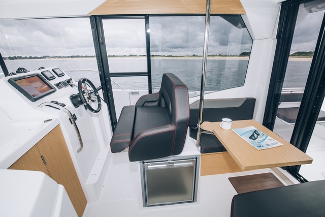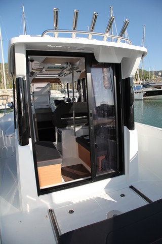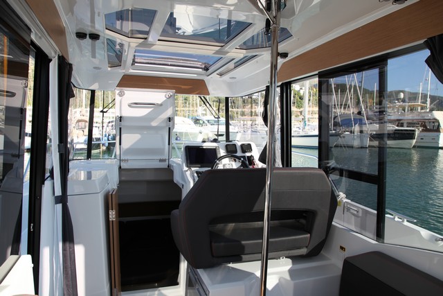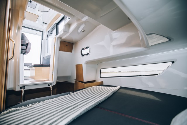 Este diseño del gabinete Sarrazin Design ha perfilado las formas del modelo con un parabrisas vertical, redondeado, una espaciosa bañera, bien preparada para la pesca, y unos interiores que se han concebido para permanencias prolongadas a bordo, con una dinete, cocina, literas y aseo.