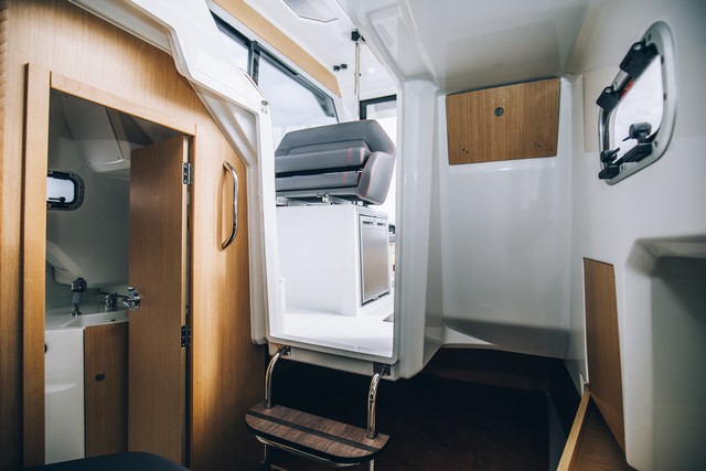 En un barco de esta eslora no se pueden esperar grandes espacios, aunque las proporciones de las cabinas y el gabinete del aseo cumplen con lo exigible en un pequeño crucero familiar. Es como una roulotte o autocaravana marina que lo tiene todo, con las dimensiones que superan lo mínimo exigible.