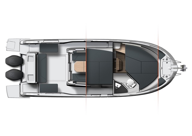 Lo de aprovechar la misma carena para dos barcos de gamas distintas es habitual —algunas Leader y NC de Jeanneau, por ejemplo—, pero no tanto como obtener de una misma carena distintas versiones del mismo barco. Aquí, con Antares y Barracuda, Bénéteau propone dos modelos de programa muy diferente, con superestructuras adaptadas a necesidades distintas, aunque con unas prestaciones en navegación prácticamente idénticas, en este caso con la diferencia de solamente 100 Hp entre uno y otro barco, que solo los distancian tres nudos en sus velocidades máximas.