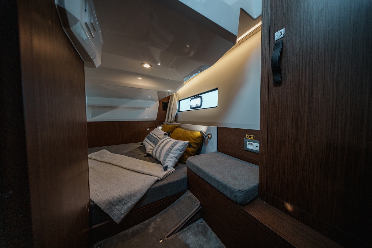 Materiales de calidad, soluciones inteligentes de almacenamiento y acabados modernos hacen que el interior de la Antares 9 sea acogedor y funcional. La ventilación y la luminosidad están garantizadas por múltiples escotillas y ventanas laterales. La calidad de los materiales, el cuidado en los acabados y la ergonomía general aportan un nivel de confort que pocas embarcaciones de este tamaño pueden ofrecer.