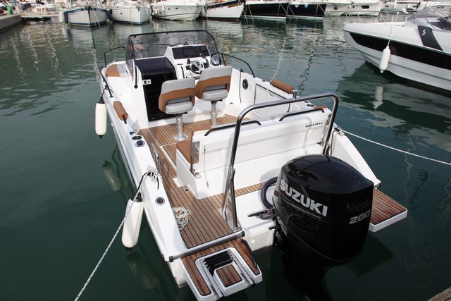 Una embarcación bien adaptada al crucero costero, con bastantes detalles, como los bancos plegables en la bañera o el doble solárium, que en el Suzuki de 200 Hp encuentra la potencia ideal para brindar los mejores rendimientos deportivos. Además, está homologada en categoría C para 8 plazas y D para 9 personas, lo que resulta más que interesante.
