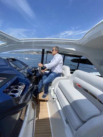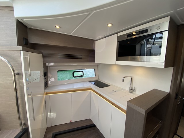 Es, sin duda, una o de los espacios favoritos de este barco. Nos gusta especialmente por su disposición, amplitud y por la visibilidad que ofrece. Es un puesto de gobierno ciertamente muy cómodo, ajustable, que permite gobernar con toda comodidad tanto de pie como sentados. No gusta que el asiento del piloto, a estribor, se separe del sobre sofá de los acompañantes. La consola, de grandes dimensiones y en tono azul oscuro para evitar reflejos, deja espacio para toda la electrónica necesaria en este barco. Opcionalmente, el paquete electrónico permite beneficiarse de la tecnología Ship Control, que facilita el control total de las distintas partes del barco, como por ejemplo aire acondicionado, iluminación, música, gestión de energía de la batería, bombas de achique o incluso los datos técnicos relacionados con los motores. Como opción, el barco puede equiparse con un joystick (cuando equipa dentrofuerabordas, no pods) y un propulsor de proa, para facilitar las maniobras en puerto. Un puesto ergonómico, elegante, y perfectamente adaptado a las necesidades de este crucero deportivo.