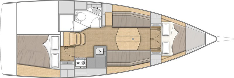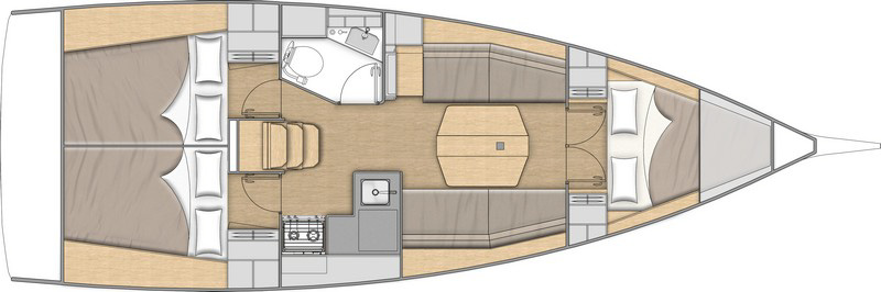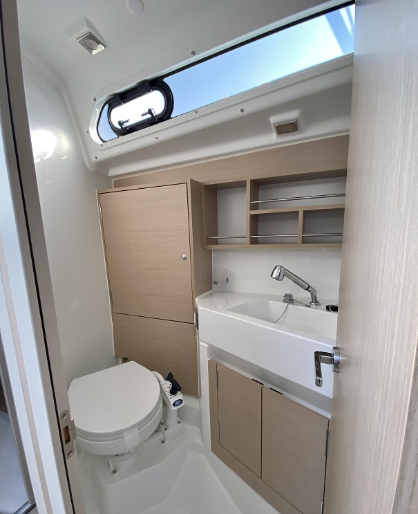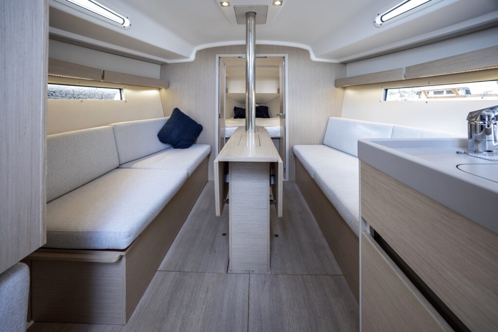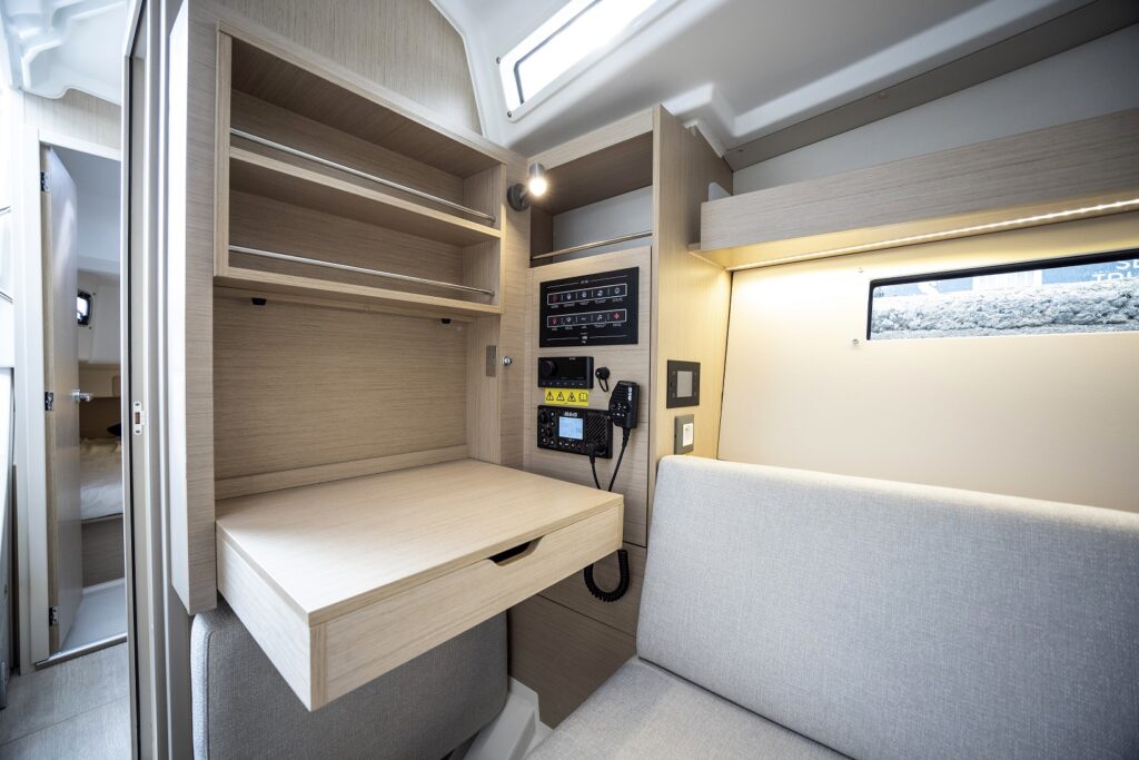 El volumen interiorque crean las formas del casco de Marc Lombard, con una altura bajo baos de 1,90 m en el salón, permite habilitar dos o tres cabinas con un baño. Si se opta por las dos cabinas, el baño puede ampliarse con un espacio de ducha separado y un gran pañol de estiba accesible tanto desde el interior como desde la bañera. También aquí el astillero acierta al ofrecer una distribución que será sin duda del agrado de muchos navegantes.