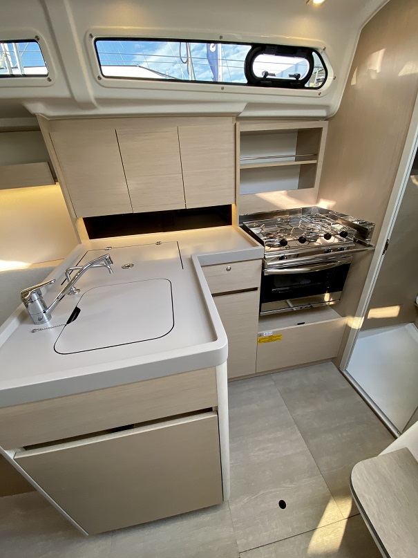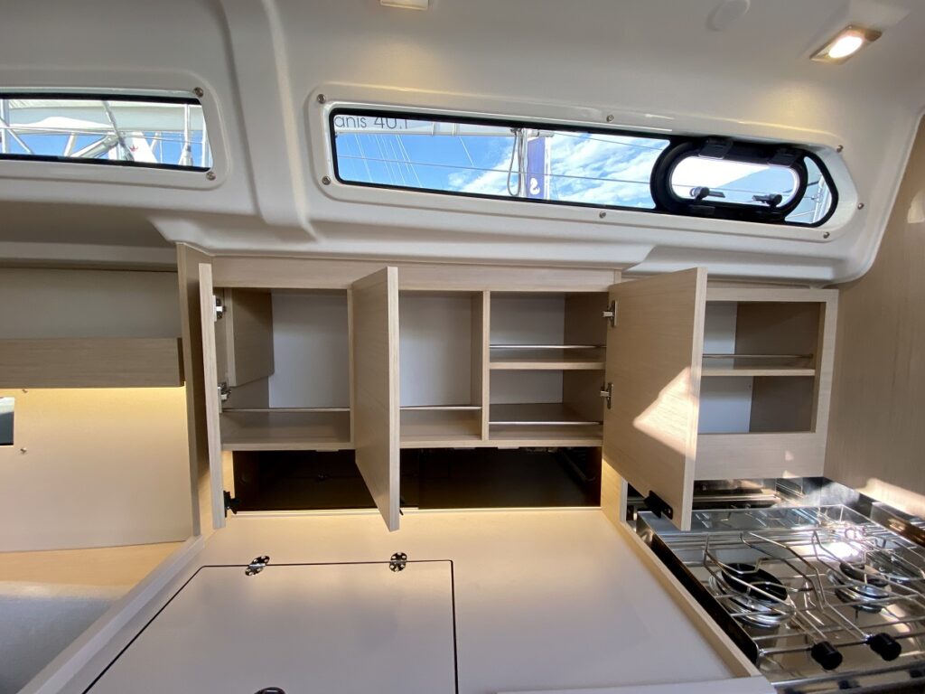 Completan la cubierta inferior la cocina en L a estribor, elemental pero suficiente, con gran nevera de 100 l de apertura superior, cocina de dos fuegos y horno, grifo mezclador de agua caliente/fría y toma de agua de mar, encimera en composite con guardamares altos de madera y armarios altos para estiba.