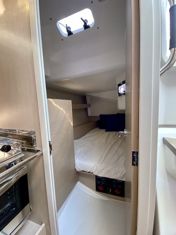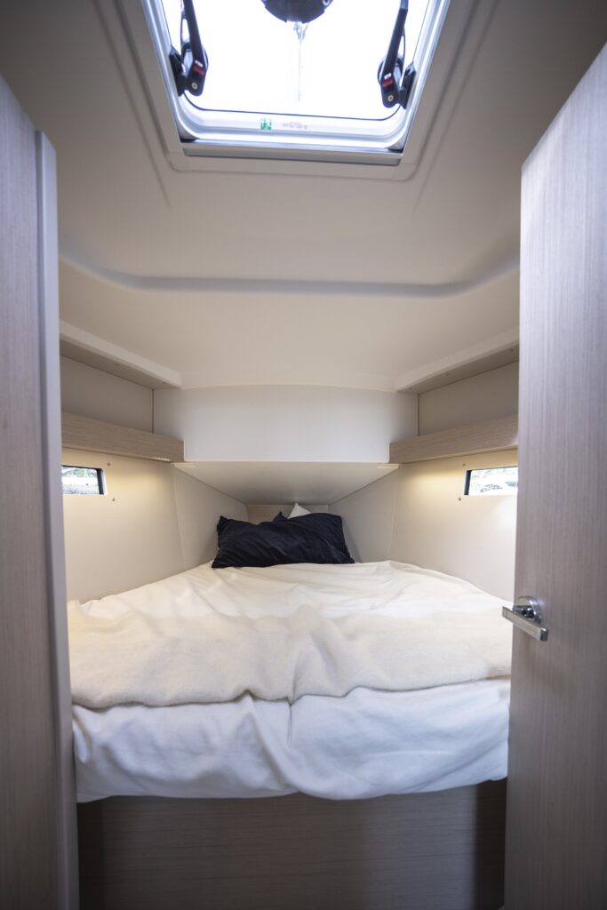 La cabina de proa es grande y alta para esta eslora y dispone de una puerta de dos batientes, lo que facilita el paso y abierta da una mayor sensación de desahogo al interior. Hay toma de 230 V y dos conexiones USB, una a cada lado de la cama. También las hay en las cabinas de popa.