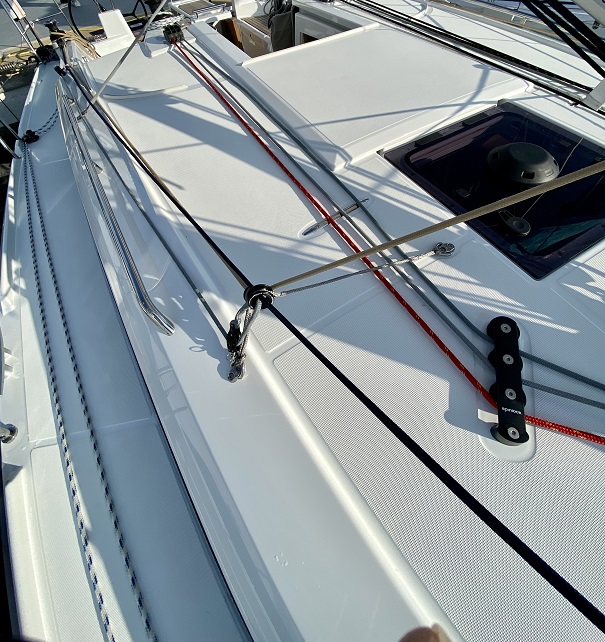Como hemos dicho, el trimado de las velas de proa se confía a anillas de fricción, lo que evita el carro de escota, y no hay baquestay, con lo que no hay cables que molesten al timonel ya sea a la banda o gobernando de pie, como suele ocurrir en veleros de poca eslora. Opcionalmente, aunque lo creemos innecesario, puede optarse por mayor enrollable.