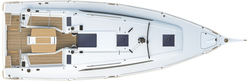 El espejo de popa se abate en casi toda su longitud para dar lugar a una magnífica plataforma. Los pasos a proa son holgados y la ausencia de carril de escota de mayor la deja totalmente libre de encombros.