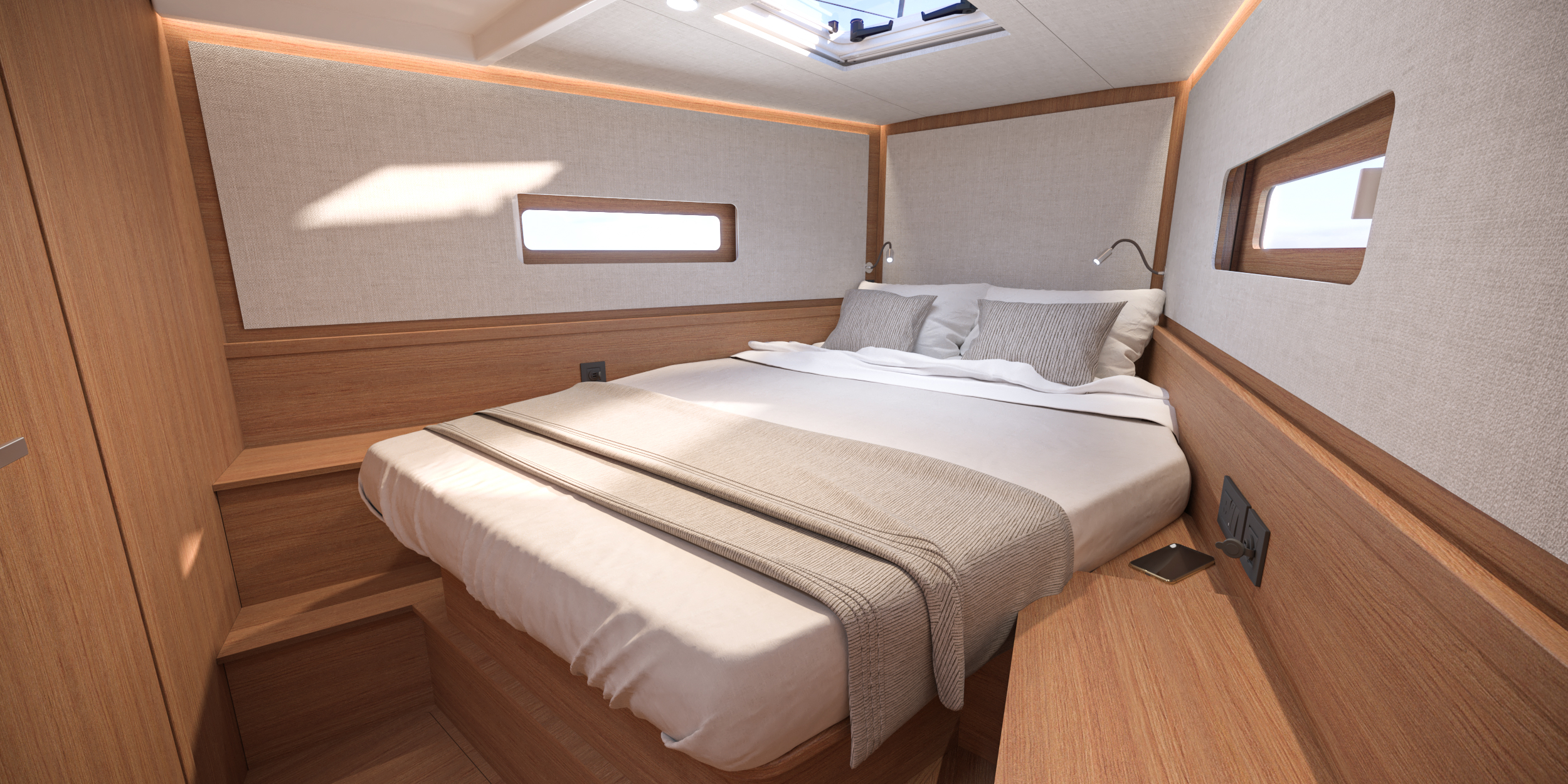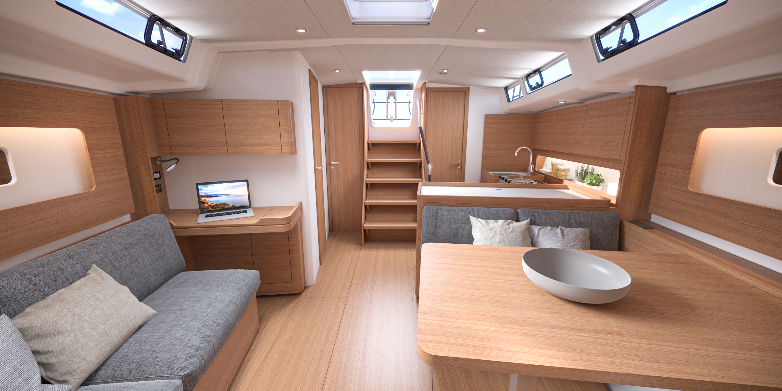 El First 44 está imbuido del estilo moderno de Lorenzo Argento y ofrece una distribución de tres cabinas y dos baños. En el salón, la mesa de seis plazas se encuentra frente al sofá y la mesa de cartas orientada a popa; su posicionamiento en relación con el mástil facilita el movimiento entre la cocina y el camarote principal, acentuando así la sensación de espacio.