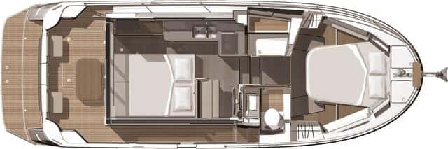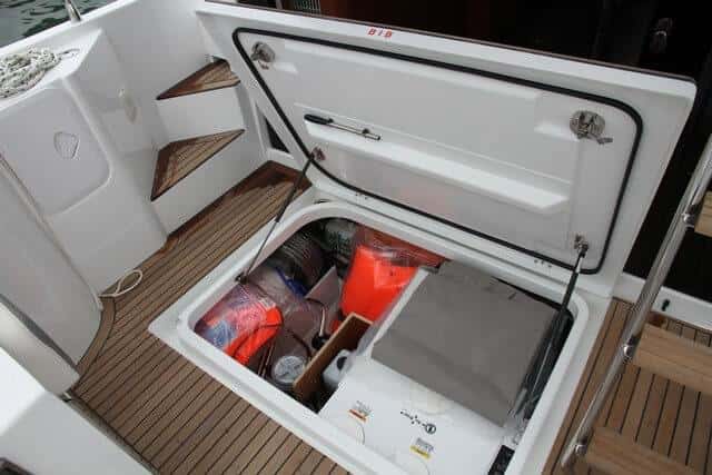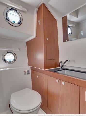 El aseo, con inodoro y ducha se ubica a estribor, bajo el puesto de gobierno. El centro del barco en la zona inferior queda ocupado por la cámara de motores, con dos los dos Volvo Penta dotados de ejes.