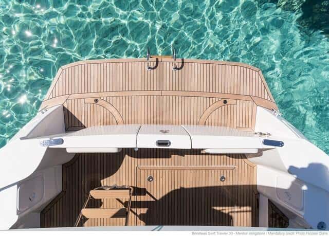 Uno de los aspectos que llama la atención a primera vista es el juego de combinaciones que admite el espejo de popa. Sumamente versátil, se abre a la plataforma de baño en dos partes pudiendo desplegar sendos asientos en los lados para generar un espacio de convivencia y obteniendo así más metros cuadros disponibles de bañera. Y además aquí se puede montar una mesa frente a los asientos, y añadir un par de sillas suplementarias.