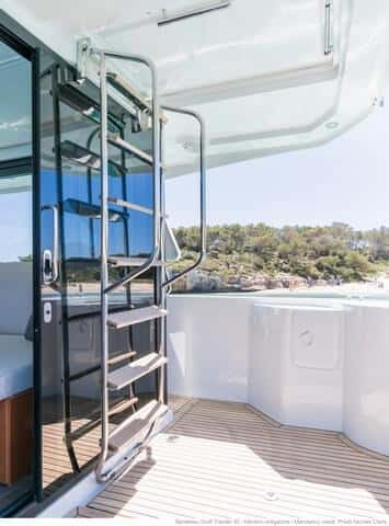 También la escalera que lleva al flybridge puede colocarse vertical con el fin de ganar más espacio. En canto a la circulación hasta la proa, los pasos laterales no tienen la misma anchura, básicamente por dos razonas: el de estribor es más ancho porque hay la puerta lateral del puesto de gobierno; y el de babor es algo más estrecho —desde luego demasiado— con el fin de ganar espacio en la cabina y porque no hace falta que mantenga la misma anchura que el otro.