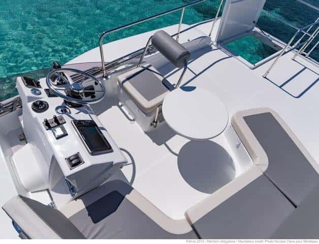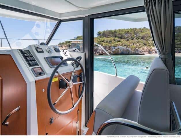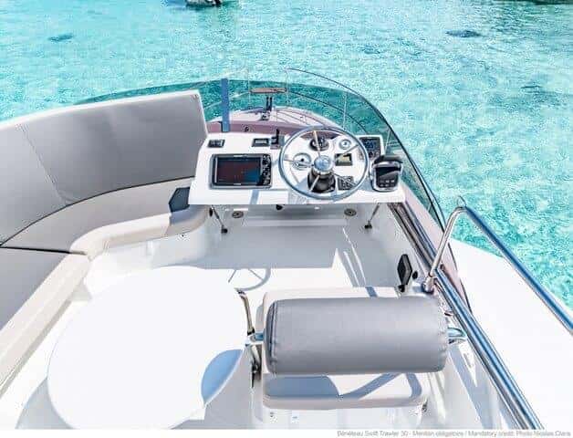 La rueda del timón, de gran diámetro, clásica, se completa con una consola bastante elevada —pero tiene una tarima que eleva el suelo para las personas de menor estatura— que distribuye ordenadamente la pantalla multifunción, las palancas electrónicas, los indicadores y el conjunto de interruptores del barco, todo coronado por el compás. Es un barco que además requiere flaps y hélice de proa, dos equipos indispensables para la navegación y la maniobra. La visibilidad es correcta y no falta un cómodo reposapiés.