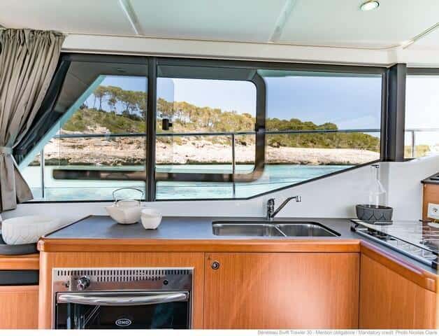 El salón superior reparte un sofá a estribor, convertible en cama desplegando el respaldo, y que esconde un asiento tipo cajón que queda perfectamente integrado en la parte inferior, con una mesa de reducidas dimensiones para no entorpecer el paso, y en la banda opuesta un mueble de servicio, con televisión, y la cocina completa formando una pequeña L junto al parabrisas, con fregadero y dos fogones, además de la nevera y el microondas, opcional, todo realizado en madera y tapicerías de tonos claros para ganar en la sensación de espacio.