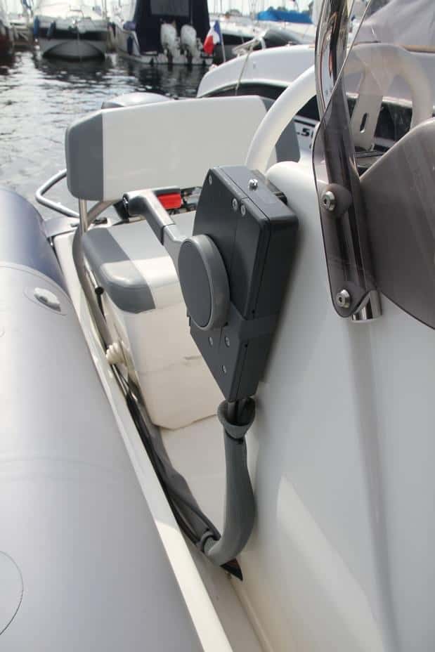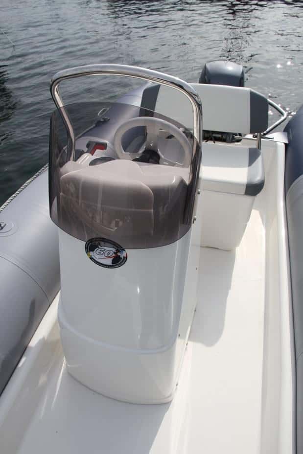 La protección al volante es buena y la palanca está bien situada, aunque tiene le pulsador del power trim por la parte exterior, lo que resulta bastante incómodo, como ocurre la mayoría de las veces en este tipo de barco.