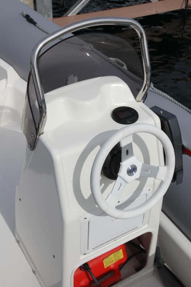 Simple y sobrio como el resto del barco, pero ubicado a babor para dejar paso hacia popa, presenta una consola con un hueco debajo para el depósito de 25 litros, que se puede sustituir por otros flexibles de 30 o de 70 litros, aconsejables dependiendo del uso.