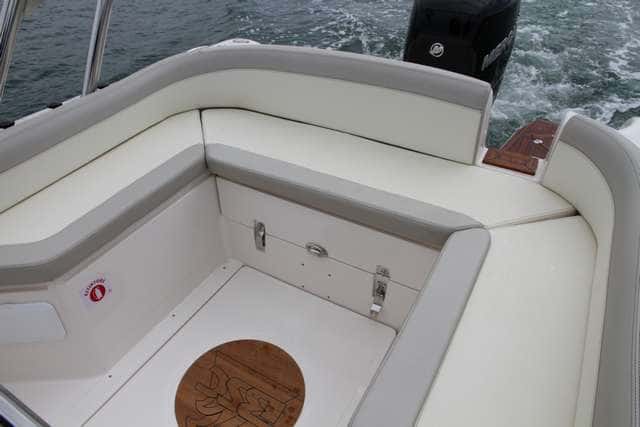 Bañera bien distribuida, aprovechada en todos los rincones con cofres de estiba, en la que no faltan buenos detalles, como los pasamanos de la consola o los refuerzos en los flotadores, con un alto nivel de calidad en los acabados de fibra y textiles.