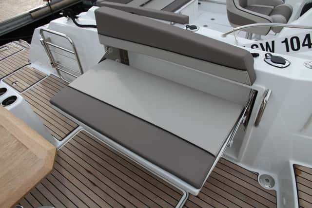 Un punto fuerte de este barco el planteamiento que se ha hecho en la distribución de la cubierta y bañera. Aunque equipa dos fuerabordas, se han dejado sendas plataformas de baño con acceso directo por babor, en las que no faltan un cofre, la ducha y la correspondiente escala de baño. Una sencilla puerta quitamiedos separa esta zona de la bañera, presidida por un banco en forma de L ocupando buena parte d la banda de estribor.