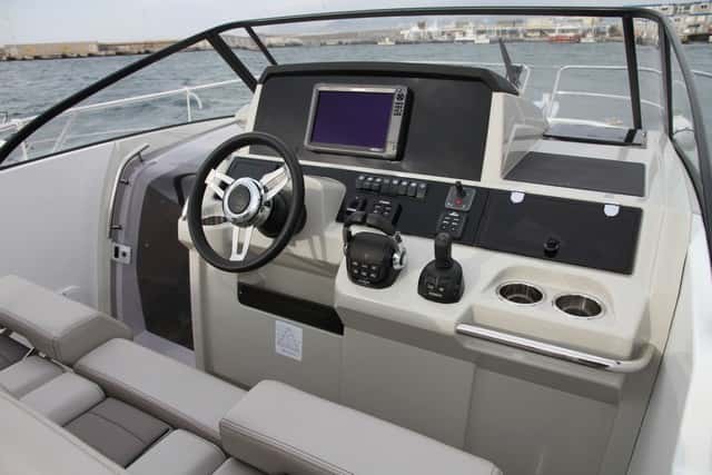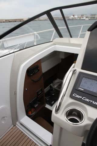 Por lo general los puestos de gobierno de las Cap Camarat resultan poco menos que impecables. En el caso de esta 10.5 WA no podía ser menos. Los diseñadores han creado un puesto para tres plazas en el que la ergonomía y la seguridad priman por encima de todo. El piloto en el centro y dos acompañantes. No faltan asideros de inox, ni reposapiés, ni asientos con base plegable, ni portavasos, ni un parabrisas envolvente, ni un volante ajustable. Todo está en dimensión justa.
