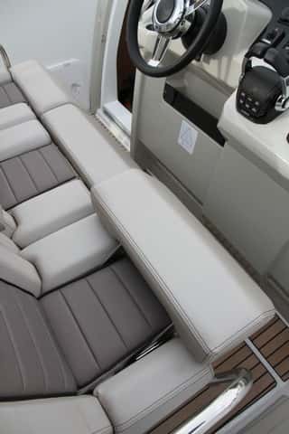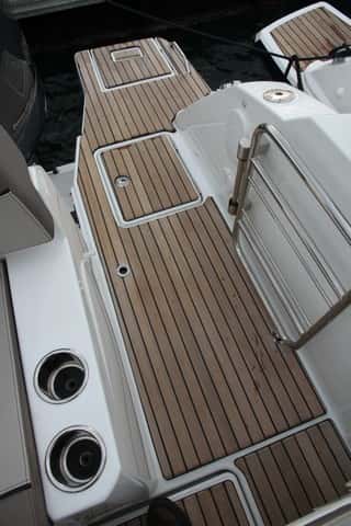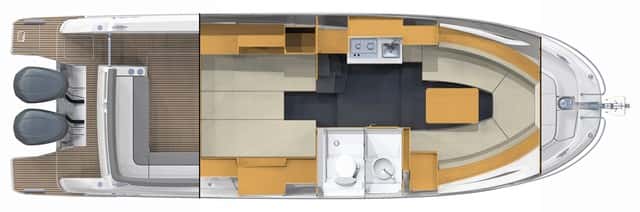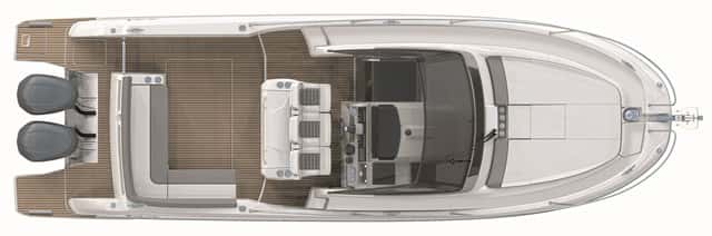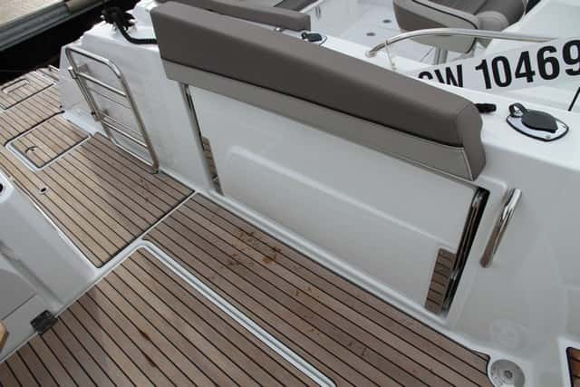 En el piso un enorme cofre para estiba y bajo los asientos también. Tras el mueble del asiento triplaza del piloto y acompañantes, se descubre un fregadero, que se puede completar con una parrilla y, de bajo con una nevera. En este cuadrado de popa destaca el espacio disponible, de tal forma que el astillero ha previsto, opcionalmente, un asiento desplegable suplementario, en la banda de babor. Se puede colocar una mesa central para formar una dinete que permite acomodad hasta ocho personas. Los portavasos, los herrajes de amarre bien colocados, la calidad de las colchonetas, y la teca de la cubierta (opcional) refuerzan la buena imagen del barco.