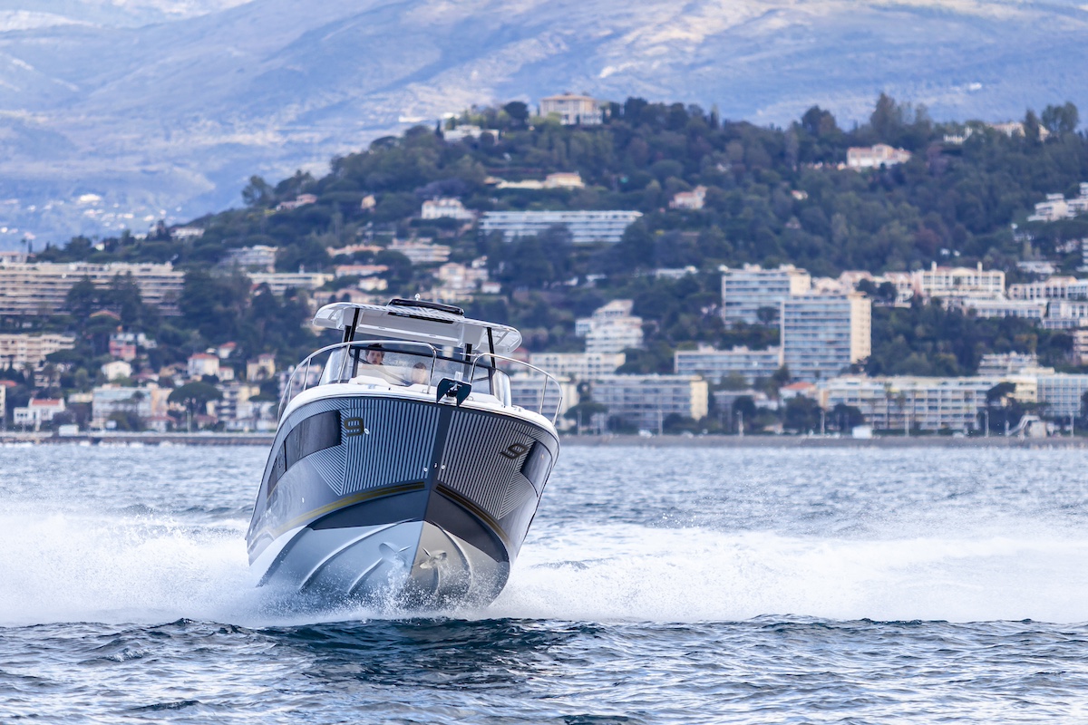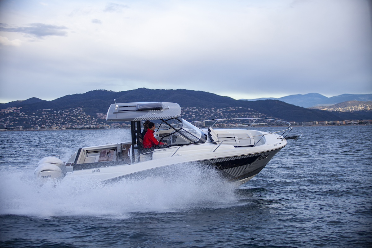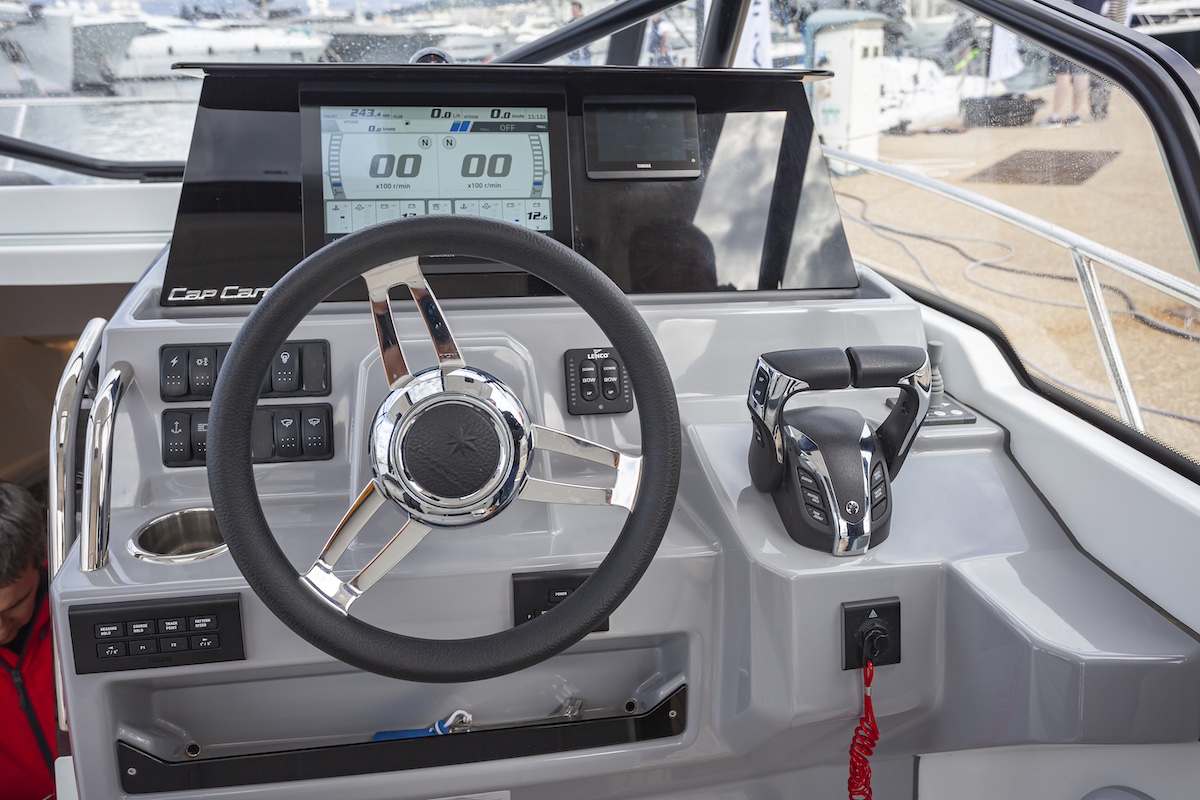 La gama Cap Camarat brinda satisfacciones a centenares de navegantes desde hace más de cuatro décadas. El barco que hemos probado durante las jornadas que el astillero francés ofreció en Cannes es la segunda serie del modelo 9.0 WA, un barco de éxito al que se le hicieron modificaciones para mejorar aún más sus prestaciones. No es un simple “lavado de cara”. De hecho, su diseñador de casco, Michael Peters, decidió aumentar la V del casco, hacerlo más profundo. Una decisión que, junto con los nuevos motores de Yamaha con sistema DES (Dirección Electrónica Digital), ha incidido directamente en la forma de navegar del barco. También se hicieron modificaciones estético – funcionales, que corrieron a cargo de Patrice Sarrasin, quien ha cambiado la estructura metálica que soporta el techo rígido para ganar solidez y soportar mejor el paso del tiempo, pero ha mantenido este elemento que es uno de los grandes signos de identidad del modelo; si bien la sección cuadrada con ángulos afilados puede no ser una muy buena idea.