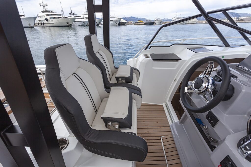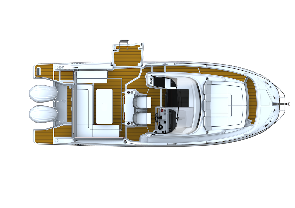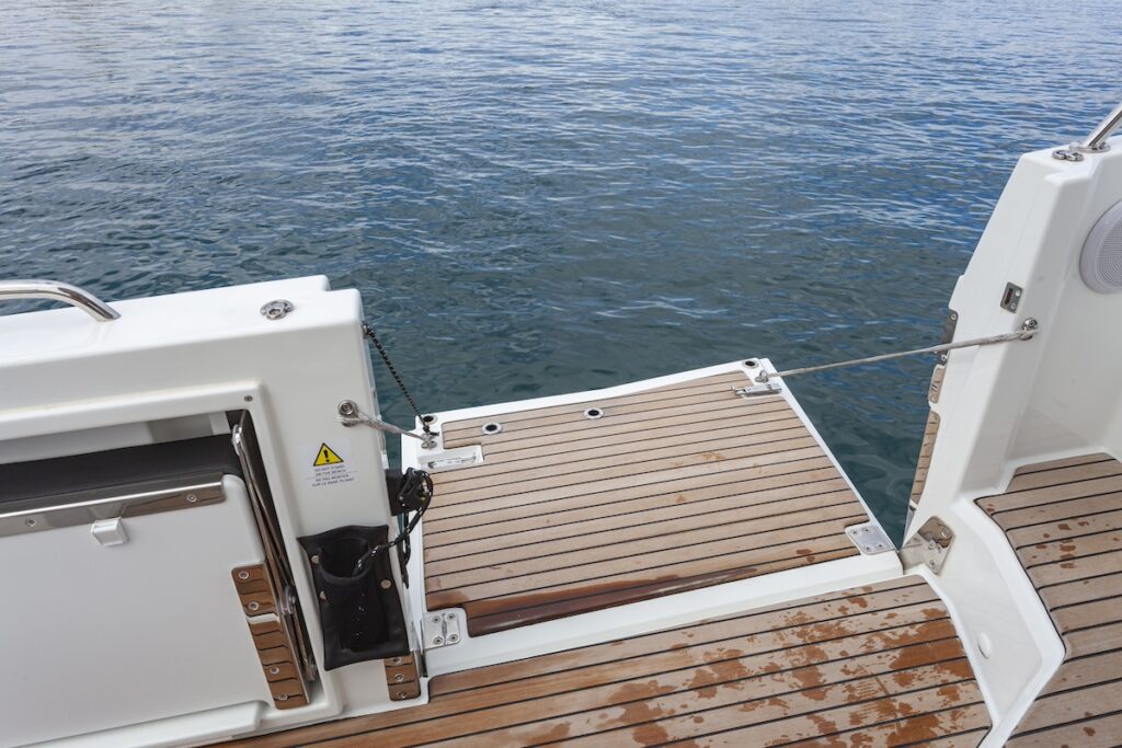 Evidentemente el espacio a disfrutar es la bañera, sin descartar su condición de consola central que invita a ocupar igualmente el solárium de proa. Pero sin dudas la bañera es el centro neurálgico de los diferentes planes de navegación posibles. La particularidad de este espacio es la polivalencia en el uso social y deportivo. Para disfrutar con la familia el despliegue de los asientos laterales abatibles es clave y, a la inversa, la bañera se puede despejar para convertirse en un barco de pesca. La puerta lateral abatible es otro acierto muy útil para darse un baño, para jugar o para recoger una pieza de gran tamaño.