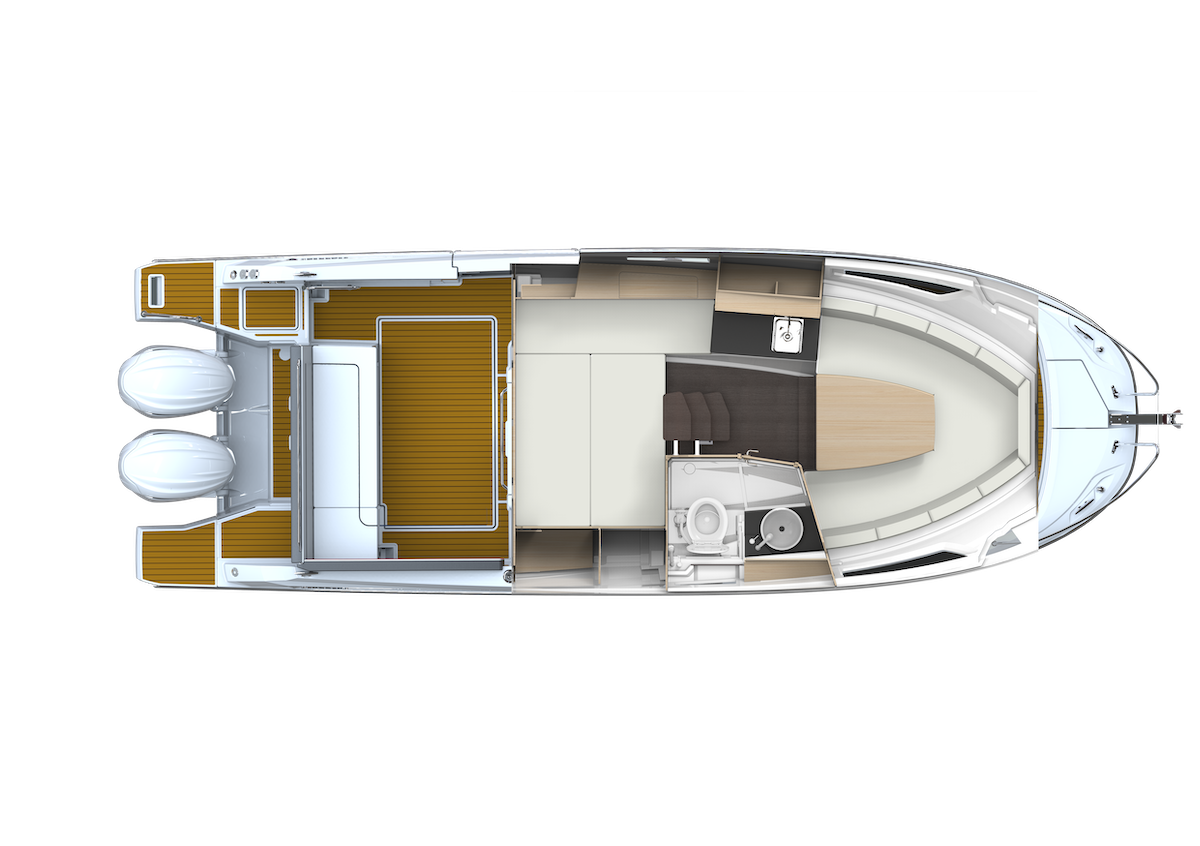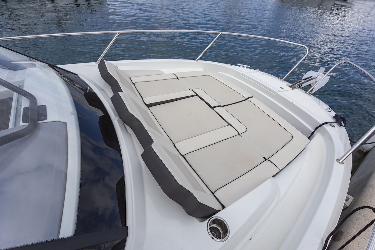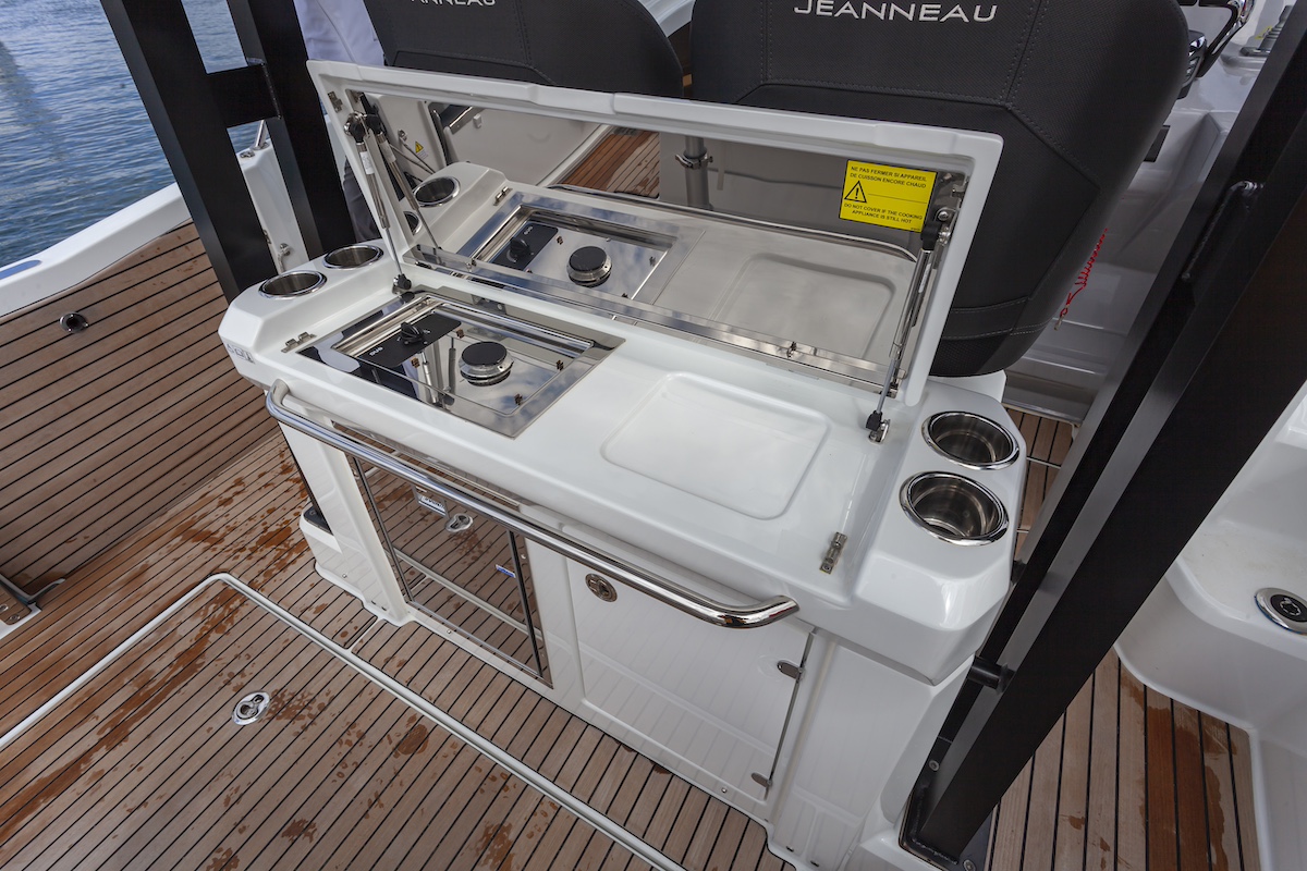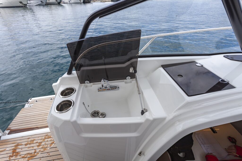 El asiento de popa es ideal para sentarse a la mesa y el respaldo abatible, que convierte todo el área en un solárium es sorprendente en un barco de esta eslora. La cocina exterior es el detalle que permite alargar los planes a bordo, es perfectamente funcional y cuenta con nevera y suficiente espacio de estiba. La motorización cierra el plan deportivo, el momento de disfrutar la navegación para quien esté al mando y las personas que le acompañen.