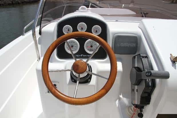 Cómodo, muy adecuado al barco, se ha ubicado en la parte de babor dejando espacio a estribor para un asiento del acompañante y la entrada a la cabina. La consola no es muy grande, pero puede repartir sobradamente los indicadores del motor. En la parte superior se ha colocado el compás y a la derecha, queda un pequeño espacio para colocar una pantalla multifunción con soporte de pie. Si se intenta colocar la pantalla en la consola, entonces los relojes del motor deberán agruparse muy juntos o, como propone el importador, se puede modificar agrandando un poco el panel para que quepa todo mejor. De todos modos es un puesto que permite dominar bien el barco, con asientos monoplaza regulables, aunque mejoraría con un sencillo reposapiés. El acompañante se puede agarrar al pasamanos de inox que rodea el parabrisas, una pieza de metacrilato que protege muy bien tanto al piloto como al acompañante. La palanca de Honda cuenta con el pulsador del power trim por el interior, de modo que fácilmente se regula con el pulgar de la mano derecha. Puesto correcto, adecuado a este barco y sus prestaciones.