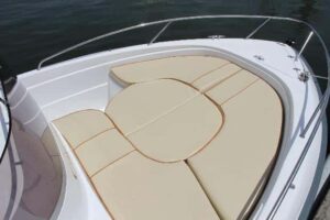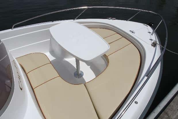 La proa, como hemos apuntado, admite la versatilidad de solárium o dinete. El pozo de anclas es correcto y los herrajes de amarre también. En popa, los dos asientos monoplaza del piloto y acompañante se pueden girar para formar una dinete montando una mesa en el centro (la misma que la de proa, a no ser que se compren dos), y el banco de popa admite un añadido para ampliar el asiento y formar un solárium alargado que abarca toda la manga.
