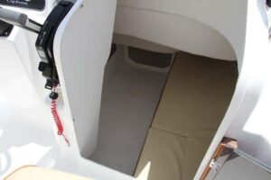 La pequeña cabina no se limita únicamente al volumen que ofrece la consola, sino que se prolonga hacia delante por debajo del banco de estribor de proa. Una litera y un hueco para estiba determinan este pequeño camarote que, opcionalmente, admite un inodoro químico.Queda aislado por puerta de metacrilato oscuro de doble hoja y la tapa de fibra superior, aunque este espacio siempre será más útil como rincón de estiba que para estar dentro. En resumen, un espacio más en este barco que sorprende por sus dimensiones,